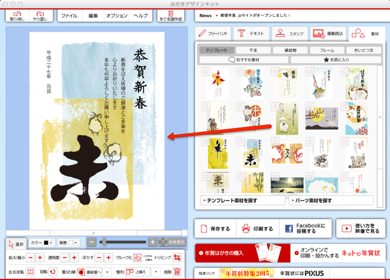 「はがきデザインキット」というソフトで作るのだが、画面はこんな感じ